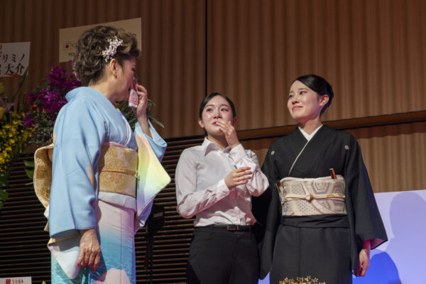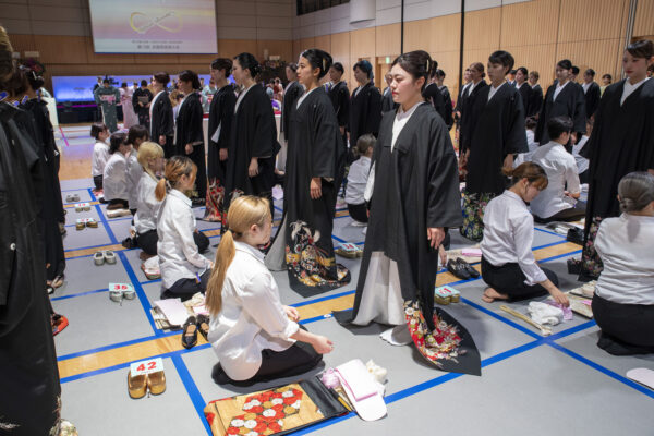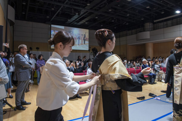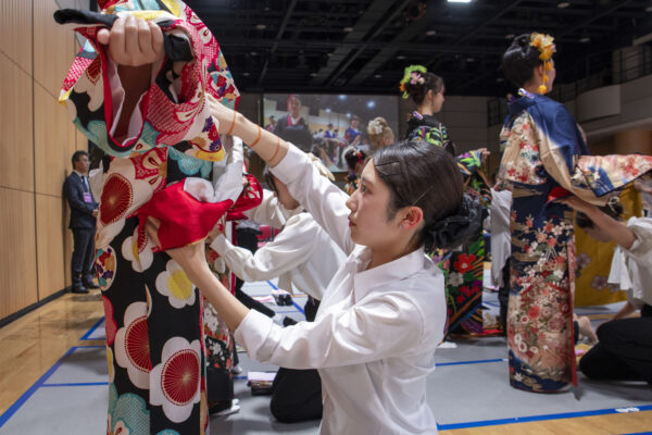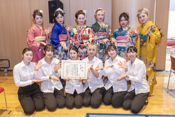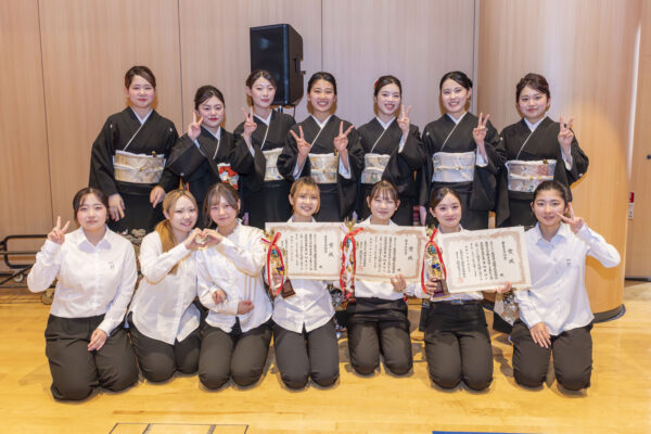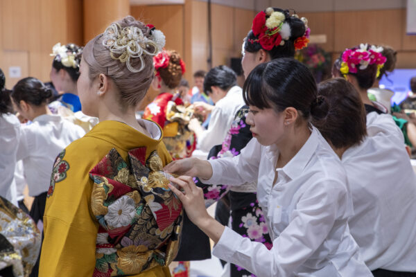 1年生は、最も格式の高い着物「留袖着付けの部」、2年生は成人式の衣装で知られる「振袖着付けの部」にエントリー!