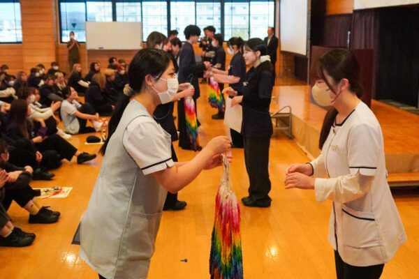 1年生が応援の気持ちを込めて折った鶴を、代々引き継ぐ千羽鶴に加えて、応援の言葉と共に贈呈しました😊